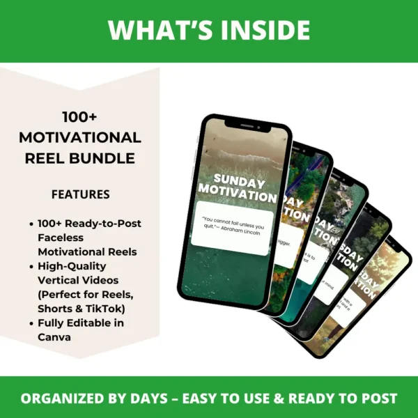 Take your content creation to the next level with this professionally designed Motivational Reel Bundle. Featuring 100+ faceless vertical videos, this pack is ideal for content creators, entrepreneurs, and coaches looking to inspire their audience daily. Whether you’re building a personal brand or running a business page, these reels are your shortcut to consistency and engagement.