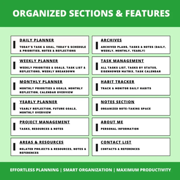 ✔ Comprehensive Planners: Daily, weekly, monthly, and yearly planning dashboards.