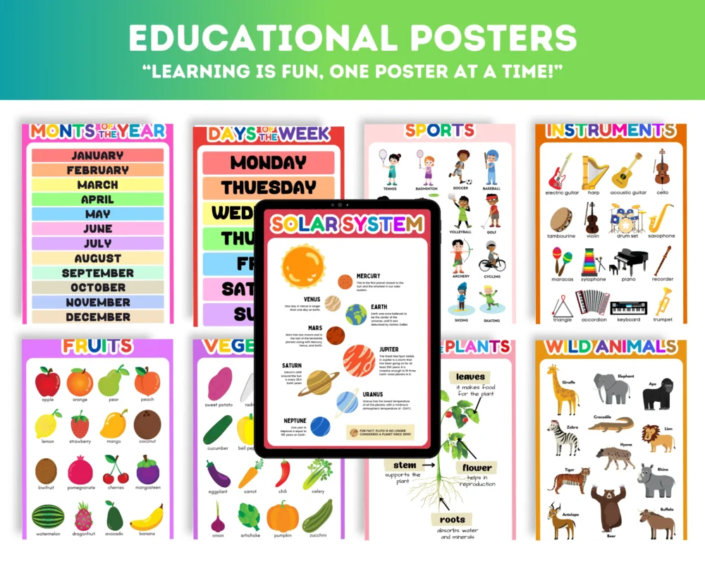 “This carousel presents a progressive learning journey for kids, starting with simple topics like greetings, letters, and numbers, and progressing to fun and educational posters about colors, animals (farm, flying, and sea), seasons, weather, directions, time, days of the week, and even the solar system! Each poster is thoughtfully designed to engage kids, making learning both enjoyable and interactive. 🎡”